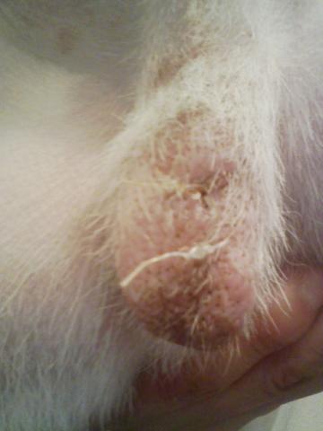 去勢後なので、袋がだいぶしぼんできて、それにあわせて傷口もだいぶ小さくなったかな。